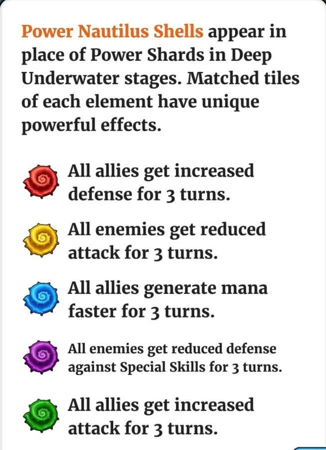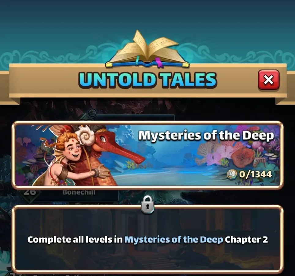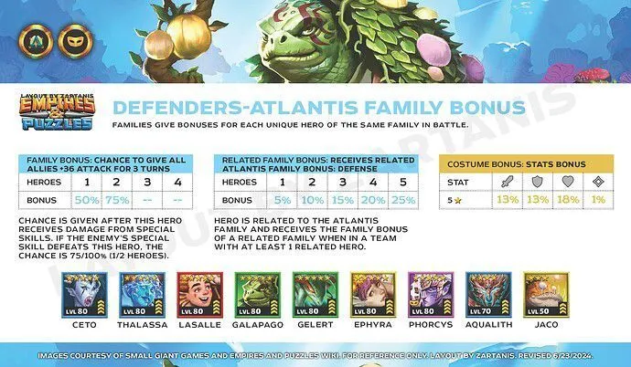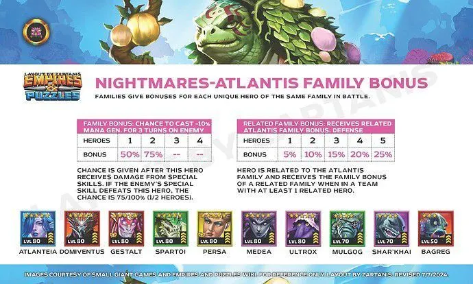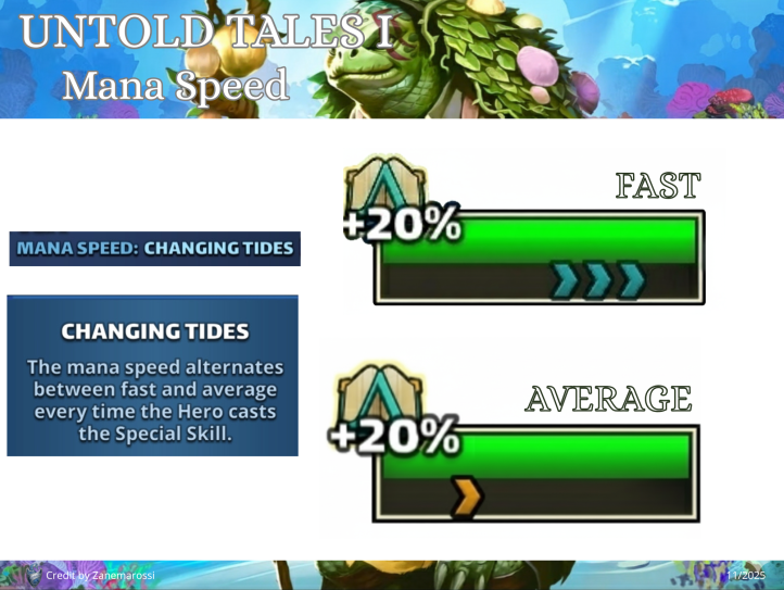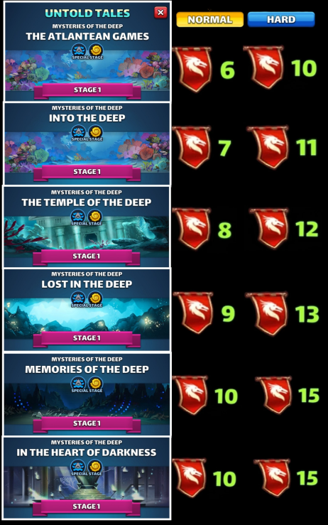 This thread is about the Untold Tales I : Mysteries of the Deep, "6th season" proposed Table of Content I. Overview II. Access Requirements III. Duration and Frequency IV. Stages V. Untold Tales Coins VI. Specific gameplay VII. Missions VIII. Summoning Portal IX. Untold Tales Families X. Various Infograpics I. Overview Untold Tales 1 : Mysteries of the Deep is the first non-world map seasonal event launched in June 2023. It differs from the first 5 seasons. It is divided into 6 chapters of 28 episodes. 2 modes are available: easy mode and hard mode. The summon portal is available including heroes specific to UT1 as well as heroes from Season 2. II. Access Conditions Access is via the seasons tab. You must have reached Province 5 of Season 5. III. Duration and Periodicity The base season is accessible at any time. However, the summon portal is associated with the reduced cost season Sunken Riches It is included in a 4-day rotation per season: S2 > S3 > S4 > S5 > UT1 > UT2 IV. Stages The UT1 are divided into 6 chapters of 28 levels unlocking as you progress. They currently include an easy mode and a hard mode. The hard level is only accessible if the easy level has been completed. A deadly mode is planned. No information on the gameplay of this mode is available to date. The required world energies vary over the chapters. Each level is divided into waves (varying from 3 to 5 waves) comprising monsters and final bosses similar to the other seasons. V. Untold Tales Coins UT Coins are earned only the first time you complete a stage: 3 coins in Easy mode, 5 coins in Hard mode. A total of 1344 coins can therefore be collected across all currently unlocked stages. When both Easy and Hard modes are completed, a specific reward is available in the "Missions" tab, containing coins and 4* ascension items. VI. Specific Gameplay The Underwater Battle The levels take place underwater and introduce an Oxygen mechanic that must be managed: Oxygen being the key resource, you must regenerate it using special tiles. The oxygen level triggers varied effects on the board. Enemy/Ally Evolutions The more the oxygen bar decreases, the more dangerous the effects. These effects are permanent. At 75% remaining Life: All enemies gain Life Steal (they heal by attacking). At 50% remaining Life: The Attack Power of all enemies increases. At 25% remaining Life: Allies receive Blindness. Enemy Death (0%): Your heroes take more damage. In addition, a random hero suffers a blind attack each turn. Recharge Oxygen To fill your oxygen bar, you can activate: Diamond (Nautilus Shell): Recharges a large part of the oxygen. Dragon (Association of 4 tiles): Recharges a small part of the oxygen. Special Tile Bonuses Power Nautilus Shells appear when you form or use a diamond. Matching or activating the shell confers a 3-turn bonus that depends on its attribute: VII. Missions Specific missions allow you to recover gems or avatars. Log of Mission Overall Untold Tales Mission: Solve the Mysteries of the Deep Note: image is just “easy” completion. A second mission will unlock on its fulfillment for the “hard mode”. Stages Missions Minion/ Mob Avatar Mission Boss Avatar Missions Guide to stages for avatar by : @ZartanisTo search stages, cover S2 to UT2 by BirksG : https://monsterfarm.pages.dev/ VIII. Summoning Portal It is available for 4 days during the reduced-cost seasons rotation: S2 > S3 > S4 > S5 > UT1 > UT2 Summoning Cost 1 Summon: 350 gems or 100 UT coins 10 Summons: 3000 gems 30 Summons: 8400 gems Each summon in the portal credits a summoning chest. Every 10 summons, the retrieved chest grants rewards. You can only obtain a maximum of 12 chests per session. Appearance Rates Available in this portal are: Untold Tales 1 heroes, Season 2 heroes, Season 1 heroes without costume. IX. Untold Tales I Families Heroes Mana Speed The trigger speed (Mana) of a UT1 hero is indicated by arrows under the character: 3 Arrows: Fast Mana 1 Arrow: Medium Mana This speed alternates between fast and medium Each time a special skill is activated: Fast → Average → Fast → Average The scroll speed of the arrows indicates how quickly the next trigger will take place. Bonus costume UT1 Families Heroes become stronger when teamed up with other unique heroes from the same family. Bonus for 1/2 heroes: 50% / 75% chance to grant all allies +36% attack for 3 turns when this character takes damage from special skills. If this character is defeated by the enemy's special skill, the probability increases to 75% / 100%. Shared Family Bonus: Bonus granted 1/2/3/4/5 heroes from the Atlantis family: +5% / +10% / +15% / +20% / +25% defense Family Heroes 5 Lasalle - C, Ceto - C, Thalassa - C Gelert - C, Galapagos - C Ephyra - C Phorcys - C 4 Aqualith - C 3 Jaco - C Heroes become stronger when teamed up with other unique heroes from the same family. Bonus for 1/2 heroes: 50% / 75% chance to confer -10% mana generation for 3 turns to an enemy who inflicts special skill damage on this character. If the enemy's special skill eliminates the character, the probability increases to 75% / 100%. Shared Family Bonus: Bonus granted 1/2/3/4/5 heroes from the Atlantis family: +5% / +10% / +15% / +20% / +25% defense Family Heroes 5 Gelstat - C, Domiventus - C Atlantea - C, Spartoi - C Persa - C Ultrox - C, Médéa - C 4 Mulgog - C Shar’khai - C 3 Bagreg - C Links to heroes will be added when the cards are redone X. Miscellaneous Infrographics Families Credit Zartanis Various farming documents Find the farming thread here: Reference Farming Credit Nynaeve, BirksG, Minzi (7D Uprasing) To search stages, cover S2 to UT2 by BirksG : https://monsterfarm.pages.dev/ Find details of stages by Elioty33 : Drive Elioty UT1