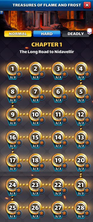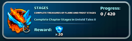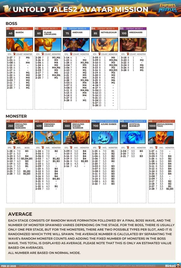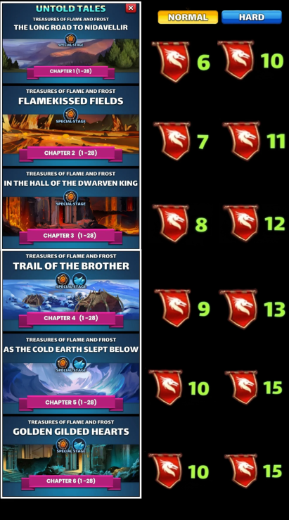 This thread is about the Untold Tales II : Treasures of Flame and Frost Table of Content I. Overview II. Access Requirements III. Duration and Frequency IV. Stages V. Untold Tales Coins VI. Specific gameplay : Runes VII. Missions VIII. Summoning Portal IX. Untold Tales Families X. Various Infograpics I. Overview Untold Tales 2: Treasures of Flame and Frost is the latest seasonal event, launched in December 2023. Like Untold Tales 1, it consists of 6 chapters of 28 stages and does not have a world map. 2 modes are available: Easy and Hard mode. The Summoning Portal is available, including UT2-specific heroes as well as Season 3 heroes. II. Access Requirements Access is via the Seasons tab. You must have completed Chapter 2 of Untold Tales 1 to access this season. III. Duration and Frequency The base season is accessible at any time. However, the Summoning Portal is associated with the reduced-cost season Dwarven Riches It is included in a 4-day rotation per season: S2 > S3 > S4 > S5 > UT1 > UT2 IV. Stages UT2 is divided into 6 chapters of 28 stages, which unlock as you progress. They currently include an Easy mode and a Hard mode. Hard mode is only accessible if the Easy mode has been completed. A Deadly mode is planned. No information on the gameplay of this mode is available to date. The World Energy required varies across chapters. Each stage is divided into waves (varying from 3 to 5 waves) featuring monsters and final bosses similar to other seasons. Chapters 4 to 6 have a specific characteristic: V. Untold Tales Coins UT Coins are earned only the first time you complete a stage: 3 coins in Easy mode, 5 coins in Hard mode. A total of 1344 coins can therefore be collected across all currently unlocked stages. When both Easy and Hard modes are completed, a specific reward is available in the "Missions" tab, containing coins and 4* ascension items. VI. Specific Gameplay: Runes This is an evolution of Season 3 Runes. Appearance: Rune Stones appear randomly on the board. Effect: They apply special effects (debuffs or buffs) to enemies or heroes, depending on their element. Evolution: A two-turn countdown is displayed. After two turns, the rune enters the "Charged" state. Credit BirksG VII. Missions Specific missions allow players to retrieve gems or avatars. Stages Missions 420x Treasures of the Flame and Frost Stages Minion/ Mob Avatar Missions 250x Engulfed Dwarf Rangers 400x Frenzied Draugr 550x Engulfed Dwarf Warrior 700x Azure Ember 850x Mystical Bomblet 1000x Smouldering Thug Boss Avatar Missions 40x Raróh 60x Flame Crawlers 75x Andvari 85x Aethslegaur 100x Hreidmarr ?x ?` Credit BirksG To search stages, cover S2 to UT2 by BirksG :https://monsterfarm.pages.dev/ VIII. Summoning Portal It is available for 4 days during the reduced-cost seasons rotation: S2 > S3 > S4 > S5 > UT1 > UT2 Summoning Cost 1 Summon: 350 gems or 100 UT coins 10 Summons: 3000 gems 30 Summons: 8400 gems Each summon in the portal credits a summoning chest. Every 10 summons, the retrieved chest grants rewards. You can only obtain a maximum of 12 chests per session. Credit BirksG Appearance Rates Available in this portal are: Untold Tales 2 heroes, Season 3 heroes, Season 1 heroes without costume. IX. Untold Tales II Families Bonus family costume Legendary Attack Bonus : 7% Defense Bonus : 7% Health Bonus : 9% Mana Bonus : 5% Epic Attack Bonus : 12% Defense Bonus : 12% Health Bonus : 12% Mana Bonus : 1% Rare Attack Bonus : 5% Defense Bonus : 5% Health Bonus : 5% Mana Bonus : 1% Kingdoms uniquely strengthen their members. The more unique members of the same Kingdom are in a team, the more powerful the Kingdom effect. Members of this Kingdom will benefit from additional advantages in the Untold Tales 2: Treasures of Flame and Frost stages. Members of this Kingdom receive a Fusion Core. The Fusion Core activates each time this character uses their Special Skill: All enemies receive Corrosive Burn for 3 turns. With a fully charged Fusion Core, Corrosive Burn deals 287 Burn damage (depends on the hero's attack stat) and reduces the target's defense by -12% each turn. Damage is higher against targets that possess minions or mega minions. Corrosive Burn damage is proportional to the core's charge. All charge is consumed upon core activation. Heroes of the Nidavellir family 5 Arthslegaur, Regin-C Andvari, Ott-C, Dagr Gandr-C, Duralfur, Hreidmarr, 4 Fjalar-C 3 Helgi-C Kingdoms uniquely strengthen their members. The more unique members of the same Kingdom are in a team, the more powerful the Kingdom effect. Members of this Kingdom will benefit from additional advantages in the Untold Tales 2: Treasures of Flame and Frost stages. Members of this Kingdom receive an Arctic Core. This character's Arctic Core charges when they take damage from normal attacks or Special Skills. The Arctic Core activates each time this character uses their Special Skill: All enemies receive Corrosive Frost for 3 turns. With a fully charged Arctic Core, Corrosive Frost deals 343 Frost damage (depends on the hero's attack stat) and reduces the target's attack by -15% each turn. Damage is higher against targets whose health is boosted or who possess minions or mega minions. Frost damage is proportional to the core's charge. All charge is consumed upon core activation. Heroes of the Mirkheim family 5 Fimafeng Högne, Svafa Fafnir, Montsognir, Bragi Thrivaldi 4 Dain 3 Bryggvir Snorri Links to the heroes will be added when the cards are redone X. Various Infographics Stages and gameplay (Awaiting high-resolution documents) Find the farming thread here: Reference Farming Find details of stages by Elioty33 : Drive Elioty UT2 FInd details of stage and gameplay by BirksG