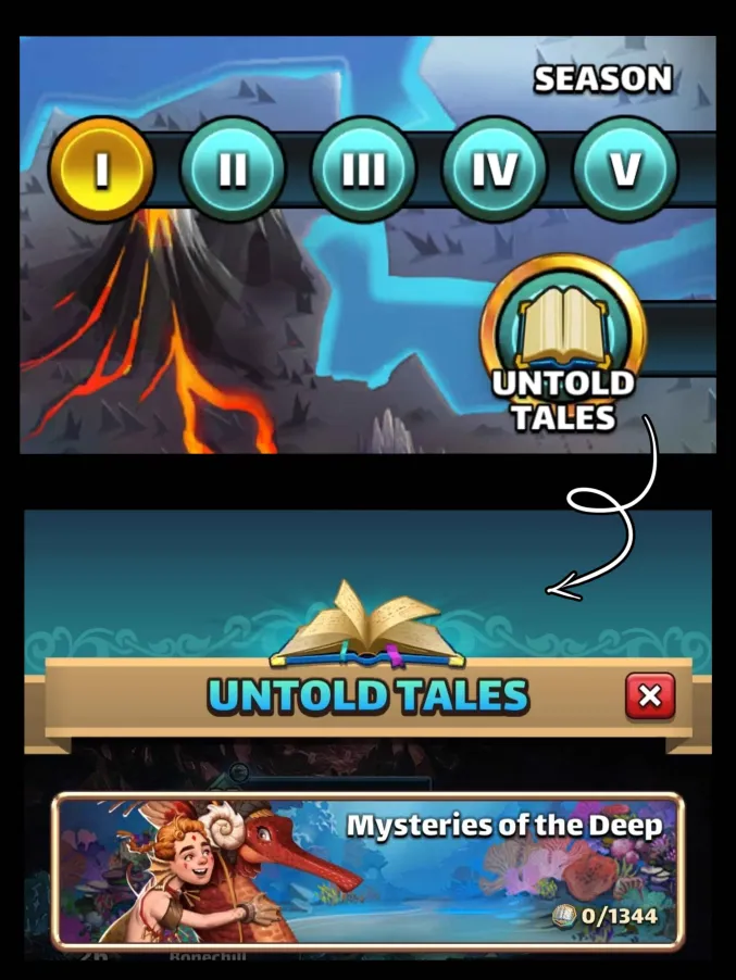 The Untold Tales I : Sunken Riches event is back at a reduced cost Event: Untold Tales I (Reduced Cost) Core Rules: The basic functioning of the season (Stages, missions, etc.) remains the same as the original version. Find the UT1 guide New Feature: The main difference is the addition of "Exquisite Clam" monsters, which allow you to earn extra rewards when you complete the levels. Access Conditions and Cost How to Access the Event Where to Find It: Access is via the Seasons Tab. Prerequisite: You must have completed Province 5 of Season 5. Base Season: It is available permanently. Frequency (Summon Portal): It is part of a 4-day rotation among several seasons: S2 > S3 > S4 > S5 > UT1 > UT2 Energy Cost (Reduced) The levels in this event cost less World Energy than usual: Easy Mode: 3 to 7 energy. Hard Mode: 7 to 12 energy. Specific Gameplay: Exquisite Clams What is an Exquisite Clam? These are creatures that can appear randomly in levels. They grant extra rewards if you complete the level: Untold Tales Coins Emblems Crafting items Resource Bundle Daily Clam Limit The quantity of Exquisite Clams you can obtain is limited each day. Starting Cap: 15 clams per day. Increase: The limit increases by 15 each day up to a maximum of 60 clams per day. Monster Lure (Paid Option) The Monster Lure is an upgrade available through a special paid offer: It immediately increases your daily clam limit from 15 to 25 per day. It also increases the quantity of specific UT pieces found in loot. How to Defeat Clams (Combat Tip) Invulnerability: The clam appears closed and is protected from direct damage for 2 turns. Attack: It then opens up, allowing you to defeat it It increases your chances of finding rare monsters by 1000% Untold Tales I Summon Portal Summon Cost 1 Summon: Costs 350 Gems or 100 UT Coins. 10 Summons: Cost 3000 Gems. 30 Summons: Cost 8400 Gems. Appearance Rate The heroes from Untold Tales I. The heroes from Season 2. The heroes from Season 1 (but without costumes). Resources (Farming) Find the farming thread here: Reference Farming Find details of stages by Elioty33 : Drive Elioty UT You can find various specific documents and guides for optimizing farming in this season. Credit Nynaeve, BirksG, Minzi (7D Uprasing)