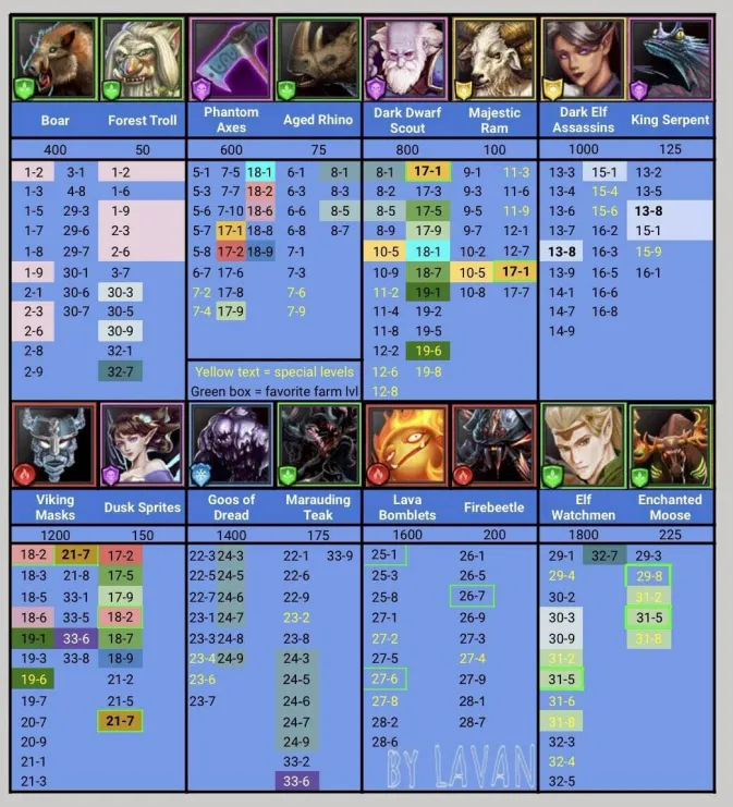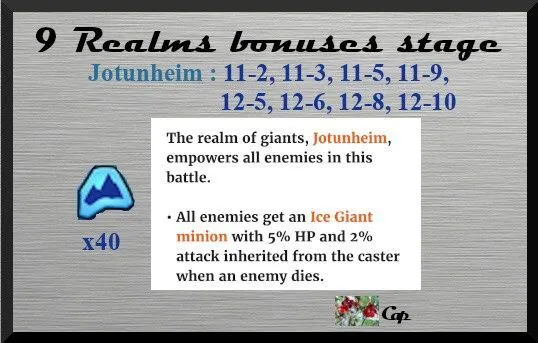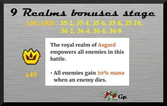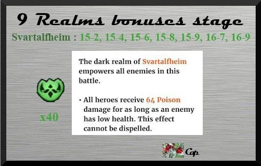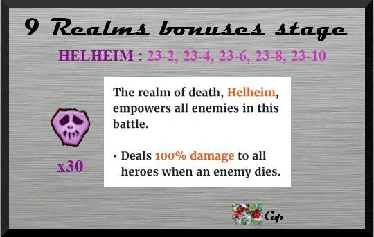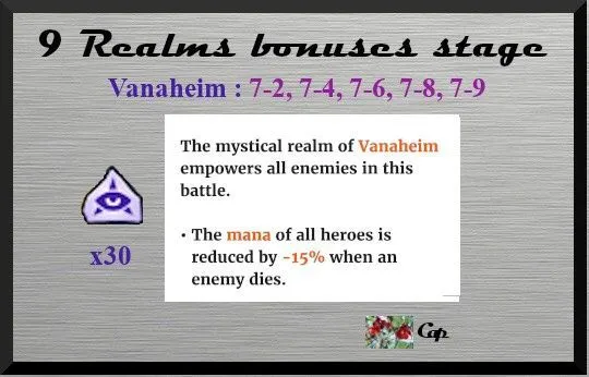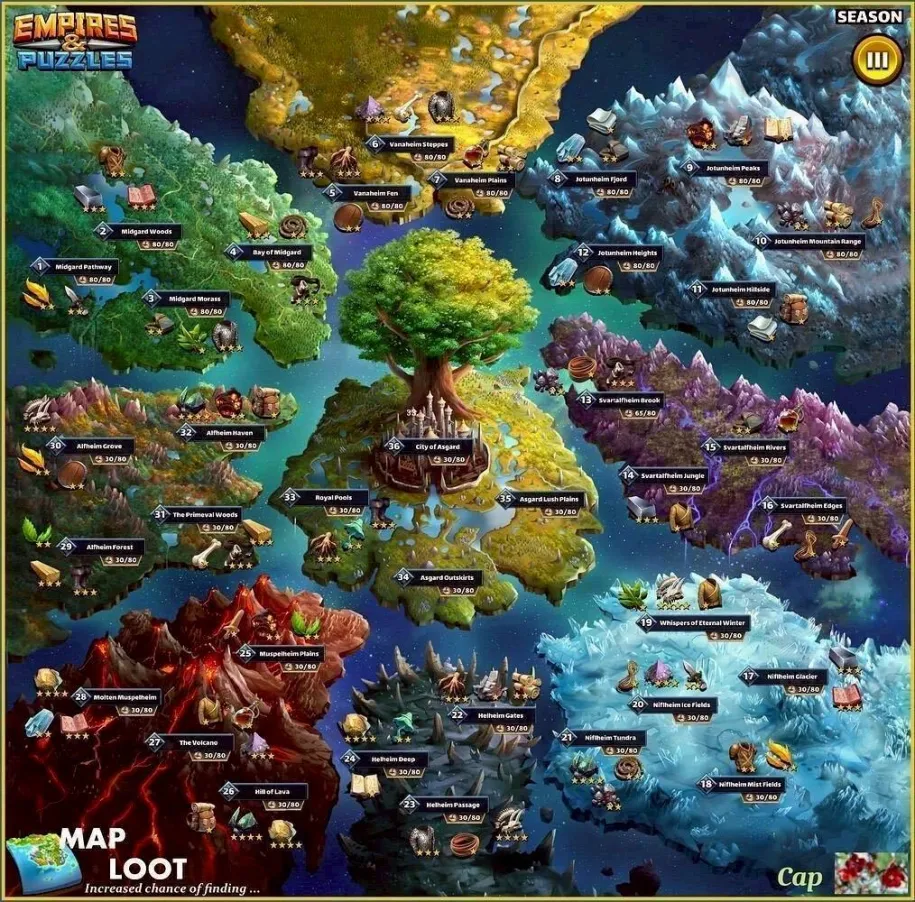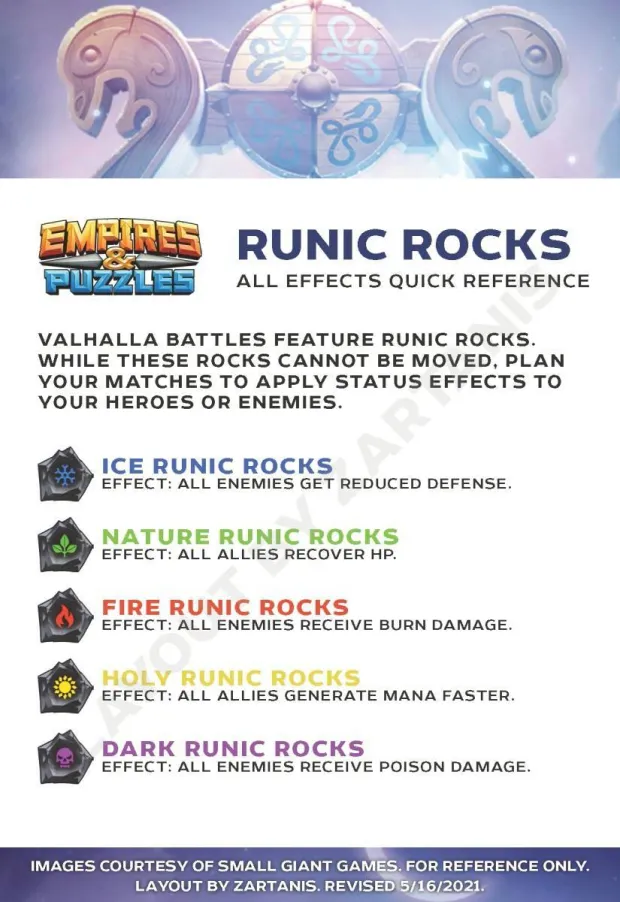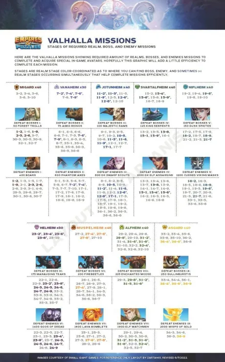 This document compiles the essential information regarding Season 3 of the game, titled Valhalla , which was initially launched on February 27, 2020. Table of Content 1. How to Access the Event 2. Stages and Specific GamePlay 3. S3 Missions 4. The Valhalla Coins 5. Summon Portal 6. Families of Valhalla 7. Resources 1. How to Access the Event Where to find it: Access is via the Seasons tab. Prerequisite: You must have completed up to Stage 15 of Season 2. Base Season: It is available permanently. Frequency (Summoning Portal): It is part of a 4-day rotation among several reduced-cost seasons: S2 > S3 > S4 > S5 > UT1 > UT2. Relive the season at a reduced cost: Season 3 : Valhalla Forever 2. Stages A. General Overview Season 3 is divided into 36 provinces of 10 stages that unlock as you progress. It features an Easy Mode and a Hard Mode. Hard mode is only accessible once Easy mode is completed. The required World Energy varies throughout the provinces from 6 to 10 (Easy) and 10 to 15 (Hard). Each stage is divided into waves (varying from 3 to 5 waves) featuring monsters and final bosses similar to other seasons. B. Stage Properties : Realms Midgard (P3) All enemies get +15% attack for as long as an enemy has low health. This effect can't be dispelled. Vanaheim (P7) The mana of all Heroes is reduced by -15% when an enemy is defeated. Jotunheim (P11-13) All enemies get an Ice Giant Minion with 5% HP and 2% attack inherited from the caster when an enemy is defeated. Svartalfheim (P15-16) All Heroes get 64 Poison damage for as long as an enemy has low health. This effect can't be cleansed. Niflheim (P19) All Heroes have -15% accuracy for as long as an enemy has low health. Chance to miss also applies to offensive Special Skills. This effect can't be cleansed. Helheim (P23) Deals 100% damage to all Heroes when an enemy is defeated. Muspelheim (P27) All Heroes get 64 Burn damage for as long as an enemy has low health. This effect can't be cleansed. Alfheim (P29-31-32) All enemies are healed by 7% when an enemy reaches low health. This effect can activate only once per turn. Asgard (P35-36) All enemies gain 20% mana when an enemy is defeated. Yggdrasil's Blessing (P36) The effect gets stronger every turn up to a maximum of x2 damage. The effect resets at the start of every wave. Unique Boss (P12-28-36) The Unique Boss heals itself and buffs are dispelled from the Heroes every 5 turns. Infographic by Zartanis C. Specific Gameplay: Runic Rocks Ice runic rocks Effect: all enemies get reduced defense. Nature runic rocks Effect: all allies recover hp. Fire runic rocks Effect: all enemies receive burn damage. Holy runic rocks Effect: all allies generate mana faster. Dark runic rocks Effect: all enemies receive poison damage. Infographic by Zartanis 3. S3 Missions Specific missions allow you to earn Gems or Avatars. Log of Missions Minion/ Mob Avatar Missions Boss Avatar Missions Realm Special Stages Missions Runic Rocks are a unique feature of the Valhalla Battles. Although they cannot be moved on the board, it is crucial to carefully choose your adjacent tile combinations to activate their powerful status effects on your heroes or your adversaries. GUIDE TO SPECIAL STAGES, COURTESY OF : @cap GUIDE TO STAGES FOR AVATAR MISSIONS, COURTESY OF : @cap @Lavan @Zartanis Ideal / Best Stages for Missions, Based on Data @Barry Farm project has collected monster counts sufficient to make recommendations on the best Stages for each Mission. And here’s a quickie summary: 4. The Valhalla Coins This is the exclusive currency for summoning Season 3 heroes. Acquisition: They are rewarded the first time you complete a map stage. Amount: Easy Mode gives 3 coins per stage. Hard Mode gives 5 coins per stage. Summoning: 100 Valhalla Coins are required for one free summon. 5. Summon Portal Summon Cost 1 Summon: Costs 350 Gems or 100 Valhalla Coins. 10 Summons: Cost 3000 Gems. 30 Summons: Cost 8400 Gems. Each summon in the portal credits a summoning chest. Every 10 summons, the retrieved chest grants rewards. You can only obtain a maximum of 12 chests per session. Appearance Rate Heroes from three groups are present: Season 3 heroes. Season 1 heroes (without their costumes). 6. Families of Valhalla Realms empower their members in unique ways, and the more unique members of the same realm there are in a team, the more powerful the realm effect is. Each hero has a costume. A. Vanaheim Realm Bonus for 1/2/3 Heroes: The mana of all enemies is reduced by -5/-10/-15% when a Vanaheim Hero is defeated. 5 Legendary : Bera, Freya, Norms 4 Epic : Mirewave B. Svartalfheim Realm Bonus for 1/2/3 Heroes: All enemies receive 22/37/64 Poison damage for as long as a Svartalfheim ally has low health. This effect can't be cleansed. 5 Legendary : Alfrike 4 Epic : Almur, Fura 3 Rare : Jarvur C. Helheim Realm Bonus for 1/2/3 Heroes: Deals 25 / 50 / 100% damage to all enemies when a Helheim Hero is defeated. 5 Legendary : Lady Loki, Tyr 4 Epic : Shadereave, Stonecleave D. Alfheim Realm Bonus for 1/2/3 Heroes: All allies are healed by 2/4/7% when an Alfheim Hero reaches low health. This effect can activate only once per turn. 5 Legendary : Frigg, Ratatoskr 3 Rare : Grevle, Kvesir E. Midgard Realm Bonus for 1/2/3 Heroes: All allies get +5/+10/+15% attack for as long as a Midgard ally has low health. This effect cannot be dispelled. 5 Legendary : Odin, Sif, Thorr 4 Epic : Brynhild, Mist 3 Rare : Bjorn F. Jotunheim Realm Bonus for 1/2/3 Heroes: All allies get an Ice Giant Minion with 6/10/14% HP and 10/12/16% attack inherited from the caster when a Jotunheim Hero is defeated. 5 Legendary : Lord Loki, Skadi 4 Epic : Jott 3 Rare : Nordri G. Niflheim Realm Bonus for 1/2/3 Heroes: All enemies have -5 / -10 / -15% accuracy for as long as a Niflheim ally has low health. Chance to miss also applies to offensive Special Skills. 5 Legendary : Fenrir 3 Rare : An-Windr, By-Ulf, Ei-Dunn, H. Muspelheim Realm Bonus for 1/2/3 Heroes: All enemies receive 22/37/64 Burn