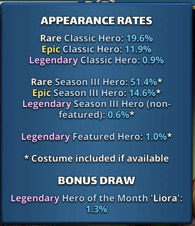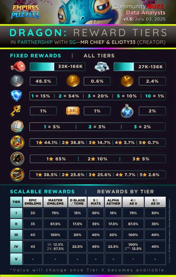 Season 2 : Atlantis Rises This thread is about Season 2 in reduced cost. The first occurrence appeared on February 2021 1. Event : Atlantis Rises (Reduced Cost) Core Rules: The basic functioning of the season (Stages, missions, etc.) remains the same as the original version. Find the base guide : Season 2: Atlantis Rewards: This season's usual rewards are improved and doubled. This event is very popular with players for farming and resources materials necessary for crafting items, basic resources or farming experience. New Feature: The main difference is the addition of "Dragon" monsters, which allow you to earn extra rewards when you complete the levels. 2. Access Conditions and Cost How to Access the Event Where to Find It: Access is via the Seasons Tab. Prerequisite: You must have completed up to stage 15 of season 1. Base Season: It is available permanently. Frequency (Summon Portal): It is part of a 4-day rotation among several seasons: S2 > S3 > S4 > S5 > UT1 > UT2 Energy Cost (Reduced) The levels in this event cost less World Energy than usual: Easy Mode: 3 to 7 energy. Hard Mode: 7 to 13 energy. 3. Specific Gameplay: Dragon What is a Dragon ? These are creatures that can appear randomly in levels. They grant extra rewards if you complete the level: Atlantis Coins Daily Clam Limit The quantity of Midgard Coins you can obtain is limited each day. Starting Cap: 15 clams per day. Increase: The limit increases by 15 each day up to a maximum of 60 clams per day. Monster Lure (Paid Option) The Monster Lure is an upgrade available through a special paid offer: It immediately increases your daily clam limit from 15 to 25 per day. It also increases the quantity of specific S3 pieces found in loot. 4. Atlantis Rises Summon Portal Summon Cost 1 Summon: Costs 350 Gems or 100 S2 Coins. 10 Summons: Cost 3000 Gems. 30 Summons: Cost 8400 Gems. Appearance Rate Presence of heroes from three groups: The heroes from Season 2. The heroes from Season 1 (but without costumes). A selection of old HOTM 5. Resources (Farming) Find the farming thread here: Reference Farming Infographics available by