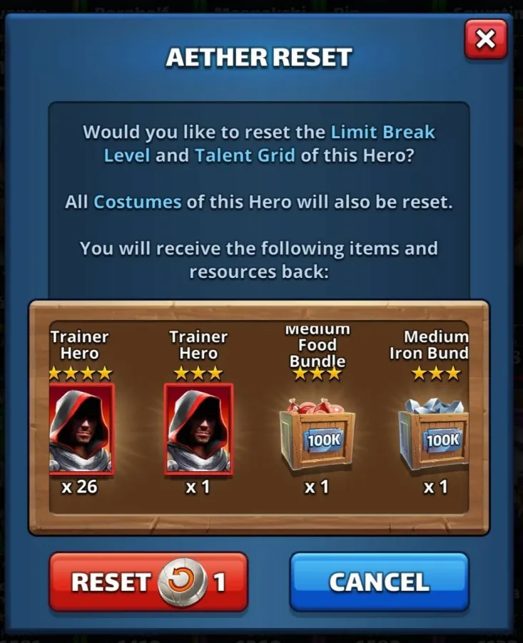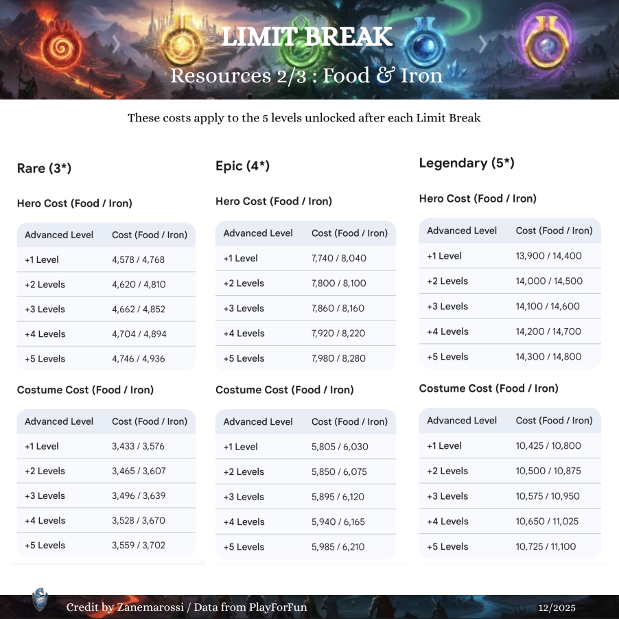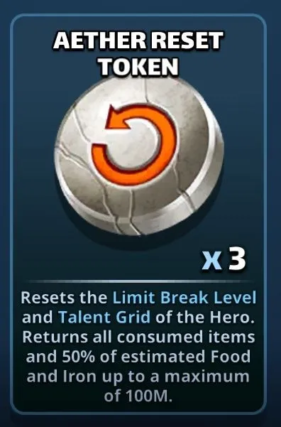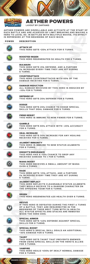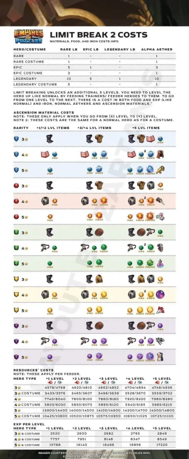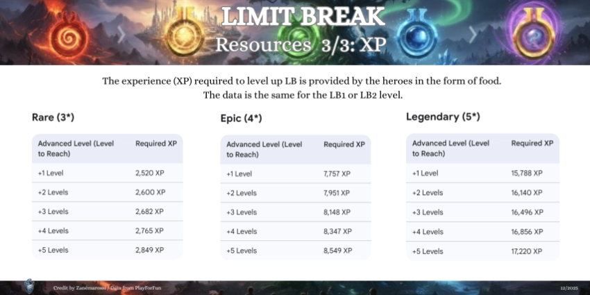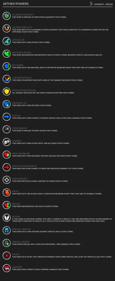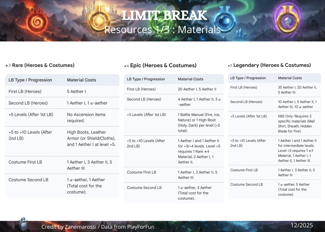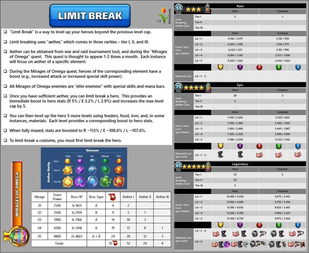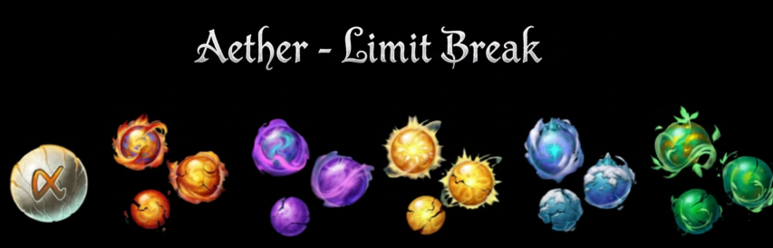 This overview details Hero enhancements allowing them to progress beyond their usual maximum level (Rare: level 50, Epic: level 70, Legendary: level 80). Last updated: June 10, 2023. Table of Content 1. Overwiew Limit Break 2. Limit Break Costs 3. Evolution Tomes 4. Aether Power 5. Ether Reset Token 6. Playlist Videos 7. Other Document 1. Overview Limit Break The feature was introduced in June 2021. The Second Limit Break, introduced in March 2023, unlocks the new passive skill "Aether Power". A. How Limit Break Works Using Ether materials unlocks the hero's maximum level. It is symbolized by a pink tier. Each Limit Break unlocks 5 additional levels. Post-unlock: The hero must be trained as usual, but requires Iron and Ascension/Improvement Materials in addition to food and EXP. Note: Certain Evolution Tomes allow you to save on some items or resources. See the relevant chapter. The LB allows for a stat increase for the hero. The total increase applies to all three stats (Attack, Defense & HP). At the 2nd LB, the Ether Power function is unlocked at the maximum level. It grants a skill bonus for 6 turns for the hero. B. Ether Materials There are three tiers of Ether for each Element : Aether I, Aether II, Aether III. Alpha Aether is a material required only for the second LB. Aethers must match the hero's attribute (element). C. Obtaining Ethers Aether can be obtained via: Omega Mirage Quest Aether Summon Raid Tournament ranking rewards. Alliance War Chest Participation in the War Chest of a minimum of 80% guarantees the obtaining of 2 Alpha Aether. Rare Quest Chests (Elemental) 2 Alpha Aether are guaranteed. Titans On Bounty Titans, achieving Rank C gives a chance to obtain an Alpha Aether as extra rewards: 3 rolls on Classic Titans, 4 rolls on Rare Titans Mystic Vision Dragon Delivery (Probabilities by delivery level). According to [MrChief's Infographic] Aether Chest Hero (Quest and Season Rewards Probabilities) Alpha Ether: 0.01% AE I: 0.9% AE II: 0.4% AE III: 0.03% Various Path of Giants Chests, Valor Chests, Summon Gate Chests, Event Rewards, etc. 2. Limit Break (LB) Costs A. Material Costs B. Food/Iron Costs These costs apply to the 5 levels unlocked after each Limit Break. C. XP Costs The experience (EXP) required to progress from one level to the next in the +5 advanced levels after Limit Break is: D. Others documents . 3. Evolution Tomes Evolution Tomes, whether specific or not, allow your heroes to gain levels while saving basic resources (Food, Iron, and Experience). Epic Experience Tome Advantage: Adds 1 level to the hero. Note: This Tome is less effective after Limit Break, as it normally adds 5 levels for a hero. Legendary Experience Tome Advantage: Adds 5 levels to the hero. Note: This Tome is less effective after Limit Break, as it normally adds 80 levels for a classic hero. Limit Break Tome I Advantage: Allows the hero to pass the First Limit, moving them to the first post-LB evolution stage, without requiring Ether materials or other ascension costs. Major Type (Element) Experience Tome Advantage: Adds 5 levels for a hero of the corresponding element. 4. Aether Power (Unlocked after 2nd LB max) All Aether powers are dispellable and activate at the start of the battle after a hero has reached level 90 and Aether level 10. In battles with multiple waves, its effect is applied from the beginning of the first wave. Aether Power is a passive skill that activates for 6 turns at the start of every battle. Power & Description Defense & Damage Mitigation 1. Bulwark: Gains +15% defense, with additional defense stacking over 6 turns. 2. Defense Up: Gains +20% defense for 6 turns. 3. Special Armor: Gains +30% defense against special skills for 6 turns. 4. Damage Reduction: Reduces all incoming damage by 10% for 6 turns. 5. Knight’s Endurance: 30% chance to reduce received damage to 1 for 6 turns. 6. Dodge: 20% chance to dodge special skill damage for 6 turns. Control & Protection 1. Taunt: Forces enemies to target this hero with special skills, protecting allies for 3 turns. 2. Fiend Resist: Immune to new fiends for 6 turns. 3. Ailment Immunity: Immune to new status ailments for 6 turns. 4. Ailment Reflect: Reflects cleanseable status ailments back to enemies for 6 turns. Survivability & Recovery 1. Regen: Regenerates 420 HP over 6 turns. 2. Heal Increase: Receives +50% healing from all sources for 6 turns. 3. Vampirism: Heals 100% of normal attack damage dealt for 6 turns. 4. Revive: If defeated within the first 4 turns, revives with 1 HP (all effects removed). Offense & Counter Pressure 1. Counterattack: Counterattacks for 60% of damage received for 6 turns. 2. Rage: Gains +15% attack, with additional attack stacking over 6 turns. 3. Gamble: Gains +50% attack with -20% accuracy for 6 turns. 4. Special Boost: Special skill deals +30% damage for 6 turns. Utility Mana Boost: Gains a small amount of mana over 6 turns. Infographic by Zartanis Nynaeve . 5. Arther Reset Token The Aether Reset Token is an extremely rare item that allows you to completely undo a Hero's progression. Reset Functionality This token acts similarly to the Talent Reset Emblem: It completely reverses the Hero's progression. It resets their Limit Break levels and their Talent Grid. Items Restored When used, the token restores: All items consumed during power-up (Aethers, Emblems, etc.). 50% of the Food and Iron spent (with a cap of 100 million). The Trainer Heroes consumed. Availability This token is not available in the game as a reward or in offers. Three copies were distributed to players in May 2023 to compensate for a major imbalance that occurred during Update 58. It may be granted exceptionally on an individual basis as compensation for a hero significantly modified by the developers after release.