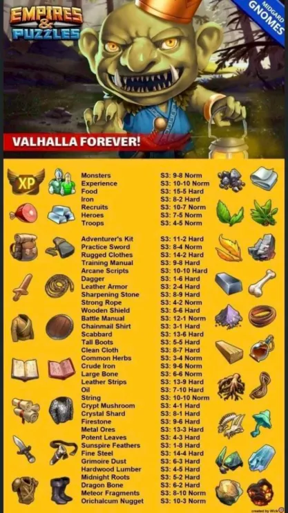 This thread is about Season 3 in reduced cost. The first occurrence appeared on Auguste 2021. 1. Event: Valhalla Forever (Reduced Cost) The Valhalla Forever : the event is a reduced cost ! Core Rules: The basic functioning of the season (Stages, missions, etc.) remains the same as the original version. Find the guide : Season 3 : Valhalla New Feature: The main difference is the addition of "Midgard Gnome" monsters, which allow you to earn extra rewards when you complete the levels. 2. Access Conditions and Cost How to Access the Event Where to Find It: Access is via the Seasons Tab. Prerequisite: You must have completed up to stage 15 of season 2. Base Season: It is available permanently. Frequency (Summon Portal): It is part of a 4-day rotation among several seasons: S2 > S3 > S4 > S5 > UT1 > UT2 Energy Cost (Reduced) The levels in this event cost less World Energy than usual: Easy Mode: 3 to 7 energy. Hard Mode: 7 to 13 energy. 3. Specific Gameplay: Midgard Gnome What is a Midgard Gnome ? These are creatures that can appear randomly in levels. They grant extra rewards if you complete the level: Midgard Coins Emblems Crafting items Resource Bundle Daily Clam Limit The quantity of Midgard Coins you can obtain is limited each day. Starting Cap: 15 clams per day. Increase: The limit increases by 15 each day up to a maximum of 60 clams per day. Monster Lure (Paid Option) The Monster Lure is an upgrade available through a special paid offer: It immediately increases your daily clam limit from 15 to 25 per day. It also increases the quantity of specific S3 pieces found in loot. How to Defeat Midgard Gnome (Combat Tip) Invulnerability: The Midgard Gnome can be killed; they have no special protections. 4. Valhalla Forever Summon Portal Summon Cost 1 Summon: Costs 350 Gems or 100 Atlantis Coins. 10 Summons: Cost 3000 Gems. 30 Summons: Cost 8400 Gems. Each summon in the portal credits a summoning chest. Every 10 summons, the retrieved chest grants rewards. You can only obtain a maximum of 12 chests per session. Appearance Rate Presence of heroes from three groups: The heroes from Season 3. The heroes from Season 1 (but without costumes). 5. Resources (Farming) Find the farming thread here: Infographics available