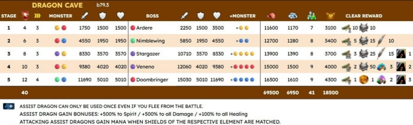 This is a 3 day long 5 stage quest in the regular game, where Dragons can be used, and gives loot mostly for Dragonspire game mode. Special Rule: Assist Dragon Mastery Assist Dragons can only be used a limited number of times. Assist Dragons are considered used when you start a quest battle. The battles will get increasingly difficultt, so plan your Teams carefully ! Assist Dragones usage limit for this quest: All Dragons: 1 Special Rule: Dragon Cave Assist Dragons are enabled in this quest. Attacking Dragons goind the following bonuses: 500% more Spirit Bonuses 500% more Damage 100% more Healing Attacking Assist Dragons gain mana when shields of the respective element are matched.