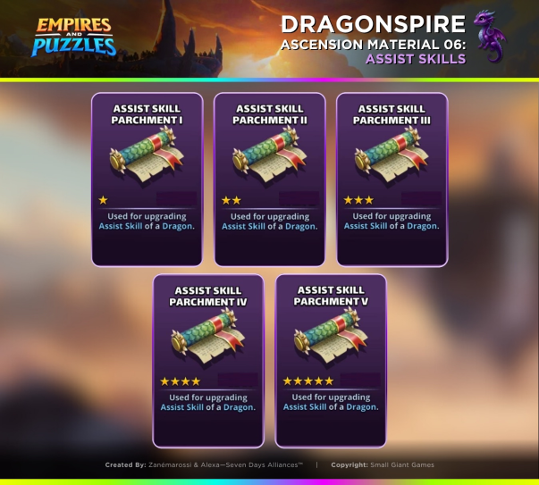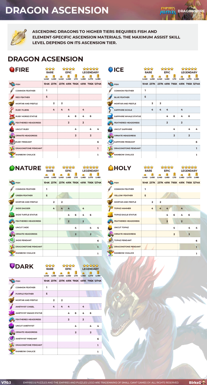 This thread is to provide insights and discussion on the Dragon Roster, Dragon Ascending, Assist Skill Upgrade and Leveling Up Costs Dragon Roster You can browse and level up your dragons here, and you can also edit your teams. The Dragons can be sorted by Power, Rarity, Elements and Name. The list is prioritized by your teams. Scroll helper and disabling Prioritizing your teams is not available here. There are no regular Common Dragons added to the game. Just trainer dragons are available for these rarities. Similarly to the regular game there are Uncommon, Rare, Epic and Legendary Dragons, and they have the same ascension tier as the heroes. 3 for Uncommon and Rare Dragons. 4 for Epic and Legendary dragons. The maximum level per rarity at the final tier for Dragons is the same as for heroes. 40 for Uncommon Dragons. 50 for Rare Dragons. 70 for Epic Dragons. 80 for Legendary Dragons The Special skill has 10 levels instead of 8. Each dragons have an Assist Skill, which can be leveled up. The maximum allowed level for the Assist Skill depends on the ascension tier of the Dragon and the. XPs provided by feeder Dragons during leveling A feeder Dragon in same element gives 20% higher XP than a different rariry. If you level up with the same dragon, then the Special skill level up chance is higher. The Special Skill level up chance is also higher if the hero has reached max level, but the - Special Skill has not reached the max level yet. Rarity/ Same element ? / XP provided / Special Skill level up chance (Before max level) / Special Skill level up chance (At max level) Dragon level progression The Dragons require Fish to be leveled up, and of course feeder dragons. - Uncommon Dragons - Rare Dragon - Epic Dragon - Legendary Dragon Uncommon Dragons Ascend 1 progess Ascend 2 progess Ascend 3 progess Rare Dragons Ascend 1 progess Ascend 2 progess Ascend 3 progess Epic Dragons Ascend 1 progess Ascend 2 progess Ascend 3 progess Ascend 4 progess Legendary Dragons Ascend 1 progess Ascend 2 progess Ascend 3 progess Ascend 4 progess Ascending the Dragon’s Ascension tiers Ascending dragons to higher tiers need Fish and Ascension materials. The Dragon’s maximum Assist Skill level is depends on the Ascenion tier. The Ascension Materials are depends on the Dragon’s element too. Here are the table for these data. Guide by BirksG Assist Skill Upgrade The Assist Skill can be Upgraded if you swtich to the Assist Skill tab, and you click on Upgrade. The opened screen contains the these information Assist Skill Name Level [from] → [to] Current Maximum Level (The maximum Assist Skill level is 10, and it can be reached only when the Dragon is at its maximum Ascension Tier). Assist Skill at current level Assist Skill at next level If the next Assist Skill level is locked, then this text appears: Ascension Level X is required for next upgrade. The Asisst Skill upgrade nest fish and Assist Skill Parchments (=ASP) . Here is the table for the required ASP materials per Assist Skill level. Guide by BirksG
