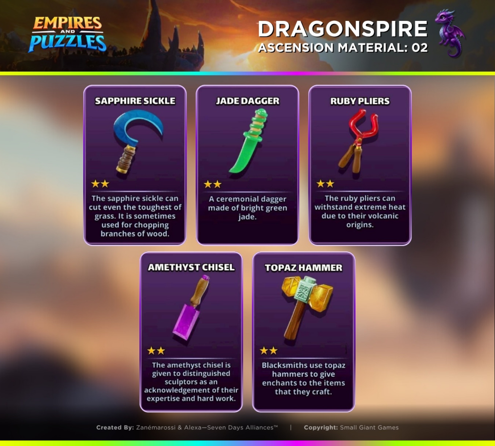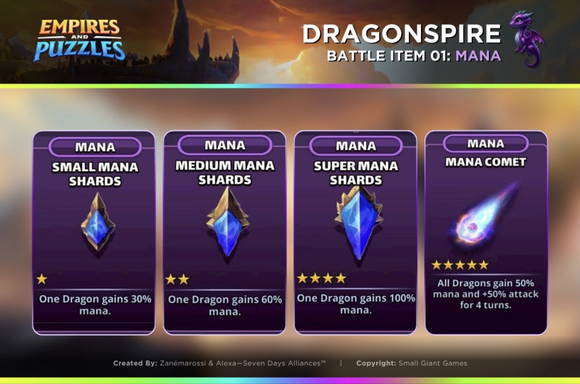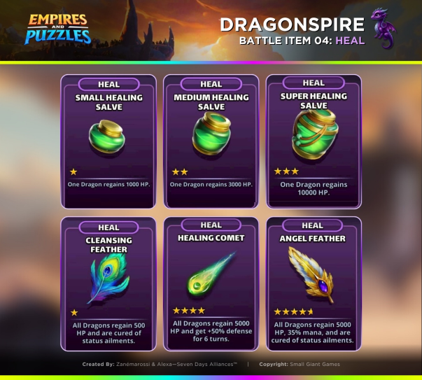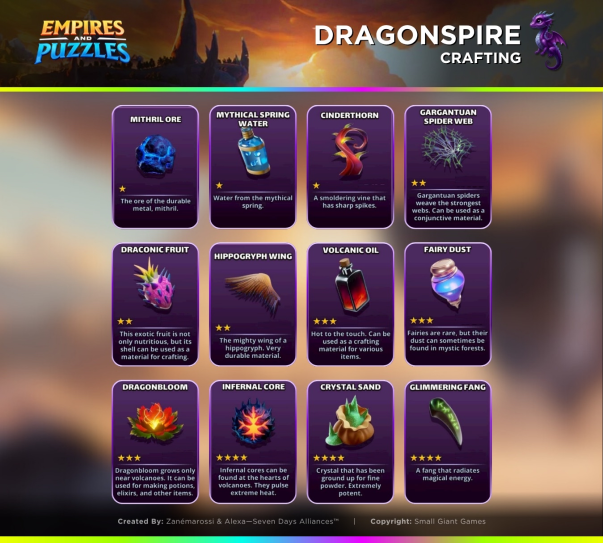 This thread is to provide insights and discussion on the Dragonspire Inventory (Ascension, Assist Skill, Battle Items, and Crafting Materials, General Items) Dragonspire Inventory This Inventory is similar what we have in the game, but it contains only Dragonspire related items. There are 3 tabs in the Inventory Materials: there 3 subtab for the materials: Ascension Assist Skill Crafting Battle Items Utility items Dragon Ascension Materials These are needed to Ascend your dragons. They have rarity similar to the Ascension Materials that exists in the game. Some are tied to an element, while other are needed to ascend different element of Dragons. You can see their purpose at the Dragon Leveling topic : Dragon Roster and Ascending Some of them are needed for Training Dragons in Hatchery. Assist Skill Upgrade Materials These are needed to Ascend your dragon’s Asist Skill. You can see their purpose at the Hero Leveling topic : Dragon Crafting Materials These are needed to Craft Battle Items in Dragon Forge. Dragon Battle Items There are 12 new Craftable batlte items in Dragon Forge, and 3 more which are not craftable, and they are available in the Shop only: Angel Feather Mana Comet Veil of Eternity You can bring only 1 battle item from each Slot type to battle. Mana Damage Heal Utiliy Items So far we have seen Dragon Resource Bundles, Energy Refill Flasks and Summon Token / Coin. The Resource Bundles are usable similarly as they are usable in the live game. The Summon tokens and coins can be used in portals Resource Token Energy Other