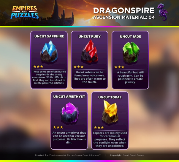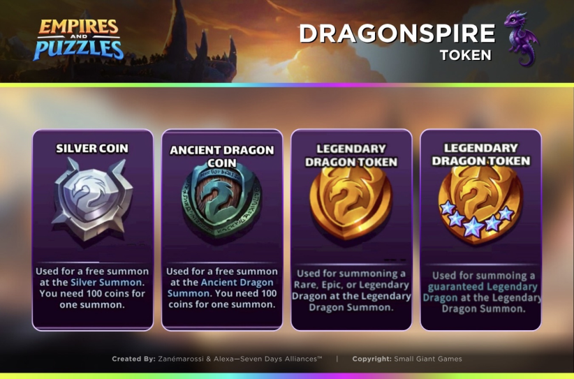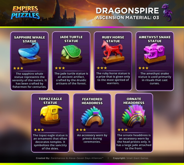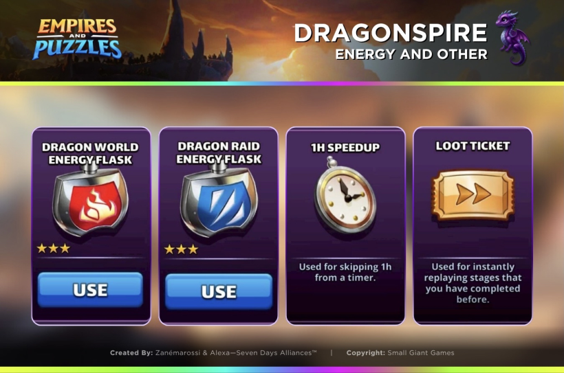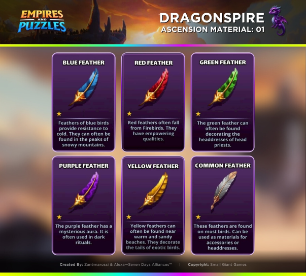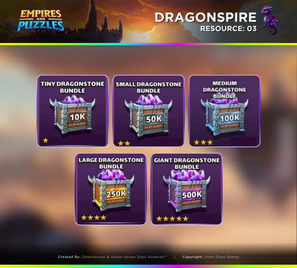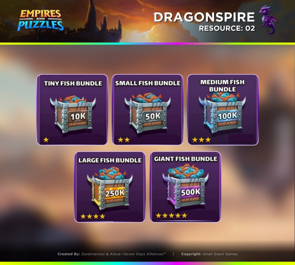 Dragonspire is a new, dragon-based world built on the traditional fortress-based world of Empathy. Table of content 1. Dragonspire Overview 2. Fortress 3. Buildings 4. Interface 5. Dragon and Portal summon 6. Dragon Assist and Rider 7. Raising a dragon 8. Dragon Map 9. Dragon Raid 10. Dragon Missions 11. Dragon Heart 12. Dragon Quests 13. Inventory 14. Path of Dragon 15. Get a slot 16. Others Documents 1. Dragonspire Overview Dragonspire: The New World of Dragons Dragonspire is like a game within the game! It is a parallel world to your main Fortress, where everything revolves around dragons. New Base: You build and manage a dedicated base with buildings and resources that are totally independent of those in your Fortress. Content and Activities: You explore a large map, launch dragon raids against other players (with a separate leaderboard), complete missions, and summon new dragons via special portals. Dragons vs. Heroes: Dragons train differently. They are simpler than heroes: no emblems, no costumes, no classes. On the other hand, their special skill can level up to 10 (instead of 8). The Links Between the Two Worlds: Despite their independence, the two worlds help each other: Help for Heroes: Your dragons can provide passive or active support skills to your hero teams. Help for Dragons: Your heroes can be equipped as Riders for your dragons to boost their combat stats in the Dragonspire world. 2. Fortress To go to Dragonspire, simply press the "Dragonspire" button at the bottom left of your Fortress screen (your usual base). Conversely, there is also a button in Dragonspire to return to the Fortress. You can switch between the two at any time. Credit Zanémarossi The Dragonspire world works a bit like your usual Fortress but is independent in terms of resources. It has its own energy. The amount of energy is the same as the amount of energy in the Fortress. However, the use of the energies is independent of one another. Credit Zanémarossi There are three basic materials: "Meat," "Iron," and "Recruits." These correspond to "Fish," "Dragon Stone," and "Baby Dragon" in Dragonspire. These are displayed at the top of the base screen. 3. Buildings Credit BirksG 9 buildings are available in Dragonspire : Dragonspire Watchtower Dragonstone Storage Egg Storage Fish Storage Fishery Quarry Dragon Forge Hatchery You can place the buildings in a similar way to a fortress. 20 buildings can be constructed depending on the level of your Dragonspire. For details on each building, please refer to the respective page : Dragonspire Buildings 4. Interface Credit Zanémarossi and BirksG 5. Dragon and Portal summon Dragons The Dragons featured in Dragonspire represent the "basic" units, comparable to the heroes from Season 1. Their trigger speed classification ranges from Fast to Slow. These dragons are available for summoning through two dedicated, permanent Portals. Credit by Nynaeve 5 Cindron, Doombringer, saestrasz Aranth, Dreamcatcher, Glacio Bonefang, Marmora, Zostrasz Ignis, Leafheart, Lux Noctur, Stargazer, Veneno 4 Eotei, Forto, Xondar Deathflayer, Sassy, Skydancer Bathosh, Nimblewing, Shen Lin Luminare, Owlford, Xiao Fang Yvestrasza, Cuddlewing, Nightwing, Mordoth 3 Krio, Ardere, Rusty, Viletusk Snowy, Leafy, Flumen, Flutterfly Leafwind, Silva, Croakster, Tropicus Glimmerwing, Solis, Talonshine, Sting Kranio, Vesperi, SparkyDuskwing Portals summons Here are the summoning probabilities and costs of the two permanent portals to summon the basic dragons. Credit Zanémarossi Others Portails Currently, only one other portal is accessible with specific dragons. Find all the information about this quest and portals on the topic: Ancien Underoot Quest Dragon feeders A new feature has been implemented since V83 with the possibility of obtaining a dragon during summons similar to the functioning of HOTM. It changes every week. The summoning rate is 1.3%. 6. Dragon Assist and Rider Assist Skills Each dragon has two types of powers: The Special Skill: This is its main attack, the one it uses when you play with it in the Dragonspire world. The Assist Skill: This is a special bonus that activates when you use that dragon with your hero team in the Fortress (the classic game mode). For this Assist Skill to be as powerful as possible, you must level it up to the maximum level, which is 10. Dragon Rider To make your dragons stronger in Dragonspire, you can assign a hero to them as a Rider. What's the Purpose? Riders replace the classic troops and give a stat bonus to your dragon. The hero's special skills are useless here; only their base stats matter! Rarity Rule: Be careful! The rarity of your dragon determines the maximum rarity of the hero you can pair with it as a Rider (a 4* dragon will only accept a 4* hero or lower). Best Choice: Always choose the hero of the correct rarity that has the best stats for maximum power! Cap: There is a cap on these stat bonuses. For the exact details, please refer to the document created by BirksG. Credit BirksG 7. Raising a dragon Leveling up a dragon is less hassle than training a hero in the Fortress. Dragons do not need: Classes, Emblems Costumes "Limit Break" (no extreme evolution) Dragon Key Features: Their Special Skill (the attack they use in Dragonspire combat) levels up to level 10 (instead of 8 for heroes). They provide Assist Skills that your heroes can use in the classic game world (the Fortress). They also grant a Spirit Bonus (a permanent stat bonus). Note: The "Special Skill" is used in Dragonspire combat, while the "Assist Skill" is the bonus for your heroes. Find the evolution of a dragon in the subject: Dragon Roster and Ascending Credit BirksG 8. Dragon Map The Dragonspire map system is very similar to the one in your usual Fortress. Current Content: The map is divided into 22 regions of 10 stages each, plus outposts, making a total of 220 stages! More regions will be added with updates. Gameplay Difference: The combat board is slightly different. You wi