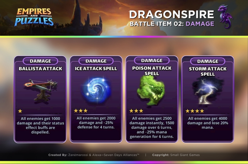 Sep 2024 This thread is to provide early insights on the Dragon Map Area and Gameplay. Dragon Map Overview Dragon Map is accessable if you switch from Stronghold view to Dragonspire view, and you click on the Map button. The Map is a full Map like what we have for Season 1-5. There is only 1 difficulty mode like in Season 1. The Map consist of 22 Areas, and each Area has 10 stages + 1 Outpost. Similarly to Season 1 each Area now ends with and Outpost, which is a Raid battle, and it gives +5% production increase for Wathctower. You need to have a Watchtower build to complete this stage. So there are 220 stages in total +21 Outposts (if there is no Outpost at the end of the last Area). The Areas have got an own name. You can only complete stages in order. Tile Boosters The Map stages boards consist of tiles in 5 rows and 7 columns. You can match at least 3 tiles from the same element. When tiles are matched they turn into fireballs and they damaging the enemies in the same column. If you match 4 tiles, then you get a special tile like the “Dragon” in the regular game, and if you activate it, then the tiles above, below, left and right are also explode. If you match 5 or more tiles, then you get a special tile like the “Diamond” in the regular game, and if you activate it, then the tiles In the third row the second and the sixth tiles is a “Tile Booster”. When a tile is matched on the Tile Booster, it launches a cluster of 9 fireballs towards enemies instead of one Battle Item Slots There are 4 Battle Item Slots similar to the regular game, but unlikely to the regular game you can not equip any battle items to any slot. Each Battle Item has a Slot Type assigned to them: Heal: Small Healing Salve, Medium Healing Salve, Super Healing Salve, Cleansing Feather, Healing Comet, Angel Feather Damage: Ballistae Attack, Ice Attack Spell, Poison Attack Spell, Storm Attack Spell, Mana: Small Mana Shards, Medium Mana Shards, Super Mana Shards, Mana Comet Misc: Veil of Attack, Veil of Protection, Veil of Eternity You can bring only one item per slot type into battle. Enemies Each enemy is brand new, and all of them have Special Skills. Dragon WE Costs The stages consume Dragon World Energy. The WE Costs for the first 3 visible Areas is 3. Silver Coins Each stage gives you 3 Silver Coins when you are completing it for the first ime. You need 100 Silver Coins for a free Silver Summon. Missions There are no Avatar missions for the Dragon Map yet. Area Properties Each Area has an own Level property, which are the following. Unique Dragon Boss Stage 10 of Area 9, 11, 13, 15 and 18 Features a Unique Dragon Boss. This battle takes places against an Unique Dragon Boss. The Unique Dragon Boss heals itself and buffs are dispelled from the Dragons every 5 turns. This is a like fighting against a Titan (with Weak spot which paralises it) after couple enemy waves. Area Completion rewards You can collect rewards after you have finished all stages and the outpost level for each area. Guides by BirksG