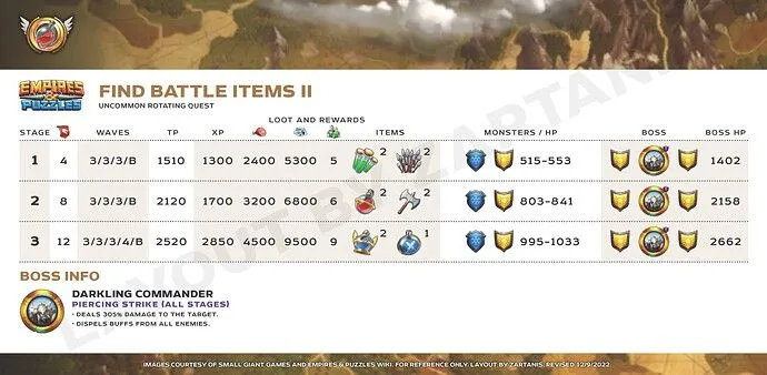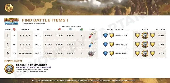 In thes quests, you can earn battle items for finishing the levels, which can be used in further battles. QUEST FIND BATTLE ITEMS I Guide by @Zartanis QUEST FIND BATTLE ITEMS II In this Quest you can earn battle items for finishing the levels, which can be used in further battles. The battle items are bit better than what you can earn in Find Battle Items I. Guide by @Zartanis