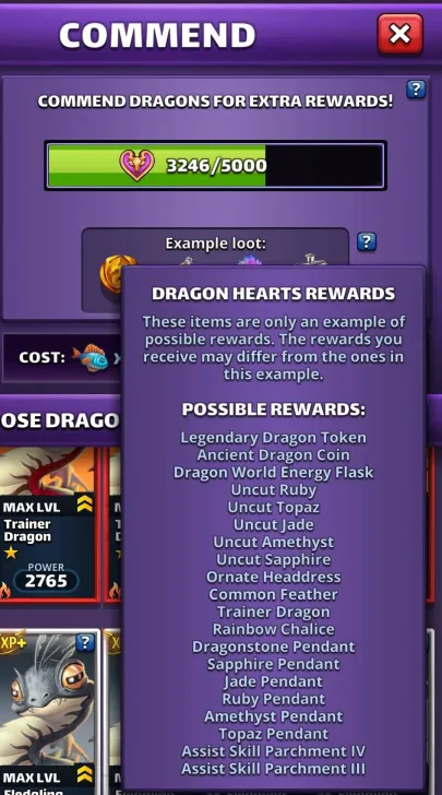 Master discussion & information thread for the Dragon Hearts feature, added to Empires and Puzzles in Version 78. Commend Dragons You can gain Dragon Hearths by commending Dragons after they are fully ascended and leveled up. To commend a Dragon select a dispensable Dragons that you want to consume. When you have collected enough Dragon Hearts you automatically get a reward. Commending Dragons follow similar rules as leveling Dragons. Commending higher rarity Dragons earns you more Dragon Hearts but costs more resources. Dragon Hearts progress is shared among all Dragons. You need 5000 Dragon Hearts to get rewards, which is a Legendary Dragon Token in Beta. Commending can be started from fully leveled dragon regardless of rarity by clicking on the Commend button in an opened Dragon’s card. Fish required is required for each selected Dragon, which is different per rarity and leveling state. If you have enough Fish, then you can commend enough dragons to get multiple rewards. The usual autofill option is available here too. Input Dragon / Heats Received / Fish required