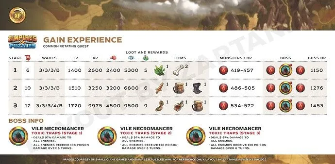 In this Rare Quest you can earn Assist Skill Parchments for Dragons and Silver Coins. Start and End dialogue Stage property: Stalactites Every 4 turns Stalacties fall from the ceiling, dealing 20% maximum health damage to all allies. Every 4 turns, all allies get -50% reduced defense for 4 turns. Guide: