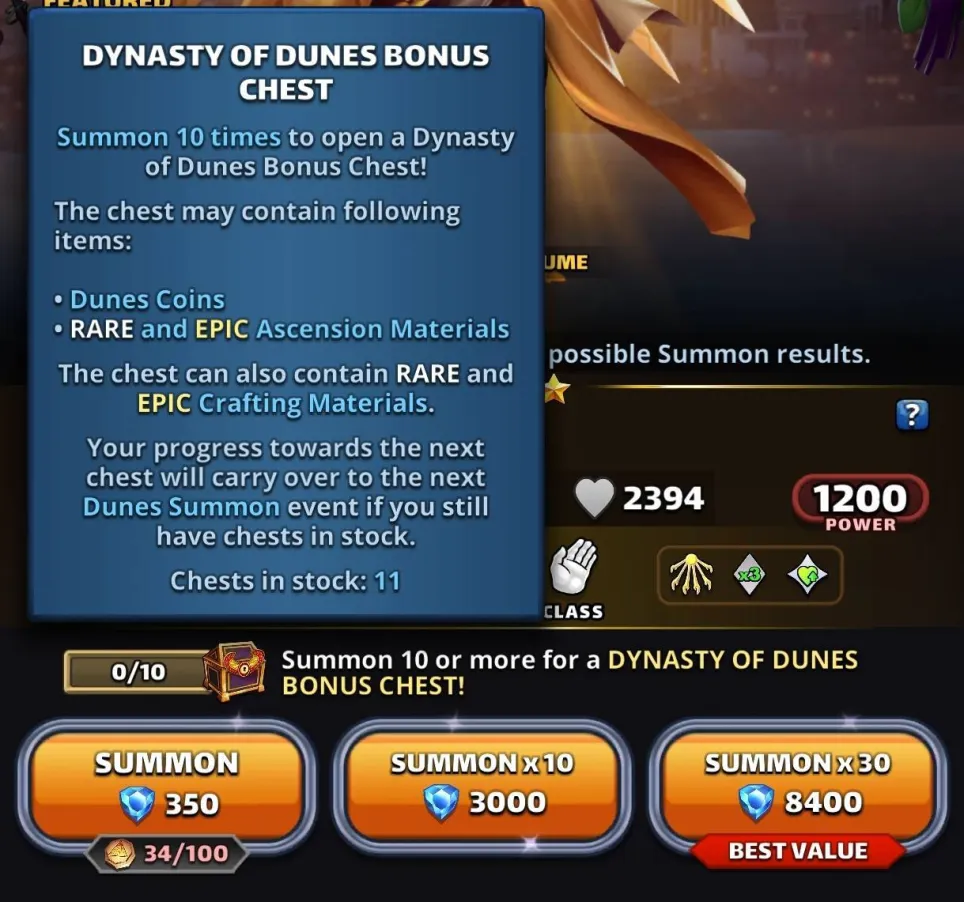 Each summon in the portal credits a summoning chest. Every 10 summons, the retrieved chest grants rewards. You can only obtain a maximum of 12 chests per session.