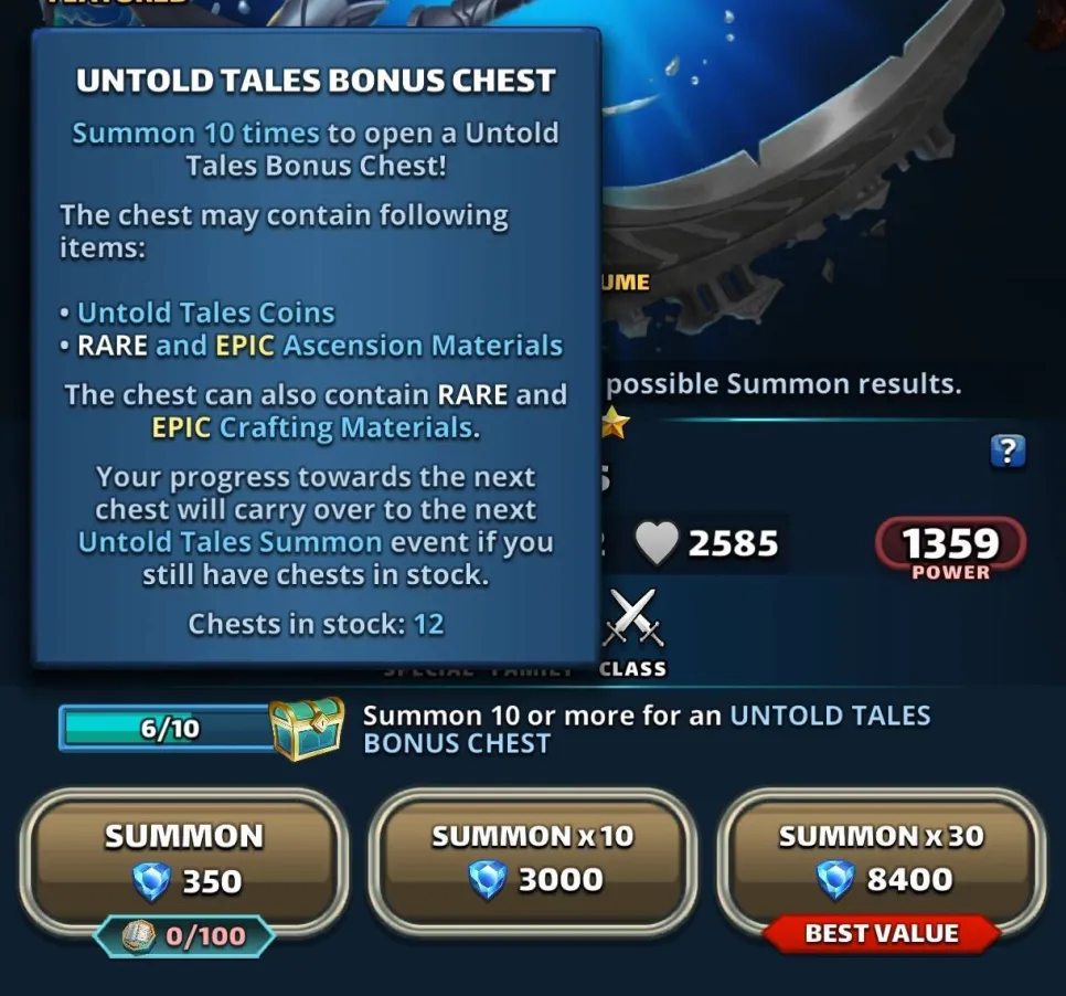 Zanémarossi Posted March 5 Posted March 5 The Untold Tales I : Sunken Riches event is back at a reduced cost Event: Untold Tales I (Reduced Cost) Core Rules: The basic functioning of the season (Stages, missions, etc.) remains the same as the original version. Find the UT1 guide New Feature: The main difference is the addition of "Exquisite Clam" monsters, which allow you to earn extra rewards when you complete the levels. Access Conditions and Cost How to Access the Event Where to Find It: Access is via the Seasons Tab. Prerequisite: You must have completed Province 5 of Season 5. Base Season: It is available permanently. Frequency (Summon Portal): It is part of a 4-day rotation among several seasons: S2 > S3 > S4 > S5 > UT1 > UT2 Energy Cost (Reduced) The levels in this event cost less World Energy than usual: Easy Mode: 3 to 7 energy. Hard Mode: 7 to 12 energy. Specific Gameplay: Exquisite Clams What is an Exquisite Clam? These are creatures that can appear randomly in levels. They grant extra rewards if you complete the level: Untold Tales Coins Emblems Crafting items Resource Bundle Daily Clam Limit The quantity of Exquisite Clams you can obtain is limited each day. Starting Cap: 15 clams per day. Increase: The limit increases by 15 each day up to a maximum of 60 clams per day. Monster Lure (Paid Option) The Monster Lure is an upgrade available through a special paid offer: It immediately increases your daily clam limit from 15 to 25 per day. It also increases the quantity of specific UT pieces found in loot. How to Defeat Clams (Combat Tip) Invulnerability: The clam appears closed and is protected from direct damage for 2 turns. Attack: It then opens up, allowing you to defeat it It increases your chances of finding rare monsters by 1000% Untold Tales I Summon Portal Summon Cost 1 Summon: Costs 350 Gems or 100 UT Coins. 10 Summons: Cost 3000 Gems. 30 Summons: Cost 8400 Gems. Appearance Rate The heroes from Untold Tales I. The heroes from Season 2. The heroes from Season 1 (but without costumes). Resources (Farming) Find the farming thread here: Reference Farming Find details of stages by Elioty33 : Drive Elioty UT You can find various specific documents and guides for optimizing farming in this season. Credit Nynaeve, BirksG, Minzi (7D Uprasing)